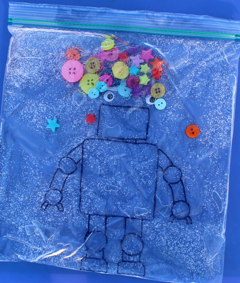 The sensory bots activity helps children make tactile discoveries while creating their own robot while developing fine motor skills. There are several buttons and shapes that can be used to help create a robot of their choosing.