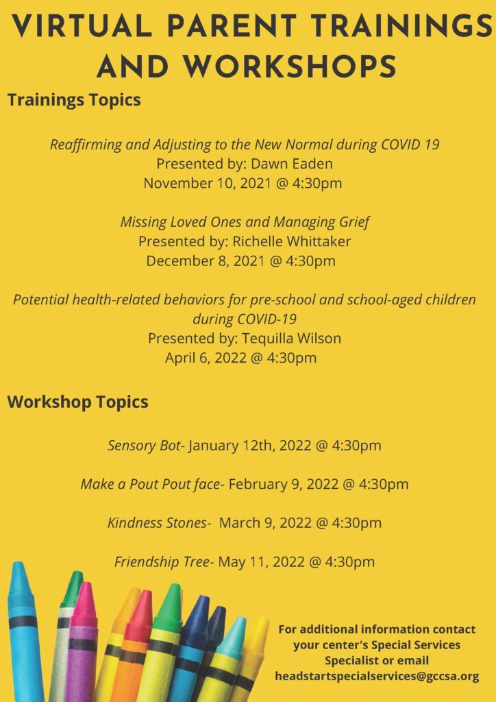 Workshops are available for GCCSA Head Start/ Early Head Start parents and guardians AT NO COST! Please sign up for as many workshops that interest you. All materials will be provided!