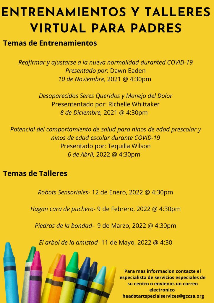 Los talleres están disponibles para los padres y tutores de GCCSA Head Start / Early Head Start sin costo alguno. Inscríbase en tantos talleres que le interesen. ¡Se proporcionarán todos los materiales!